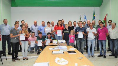 Oito famílias associadas da Cooper A1 receberam, na terça-feira, dia 17/04, um bônus financeiro em virtude dos altos níveis de organização em seus negócios. Tratam-se das famílias que tiveram, em 2016, suas propriedades rurais certificadas no Propriedade Rural Sustentável da Aurora Alimentos (PRSA). Os cheques que somam quase R$ 20 mil foram distribuídos durante a reunião do conselho de administração, na matriz da Cooper A1, em Palmitos, SC.