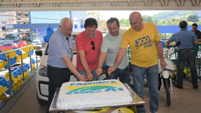A manhã de sábado também ficou marcada por um momento muito especial. Além do encerramento da “PROMOÇÃO 300 MIL EM PRÊMIOS PARA COMEMORAR 85 ANOS COM VOCÊ”, os clientes, cooperados e colaboradores participaram do corte do bolo alusivo ao aniversário da cooperativa, realizado pelos diretores da Cooper A1.