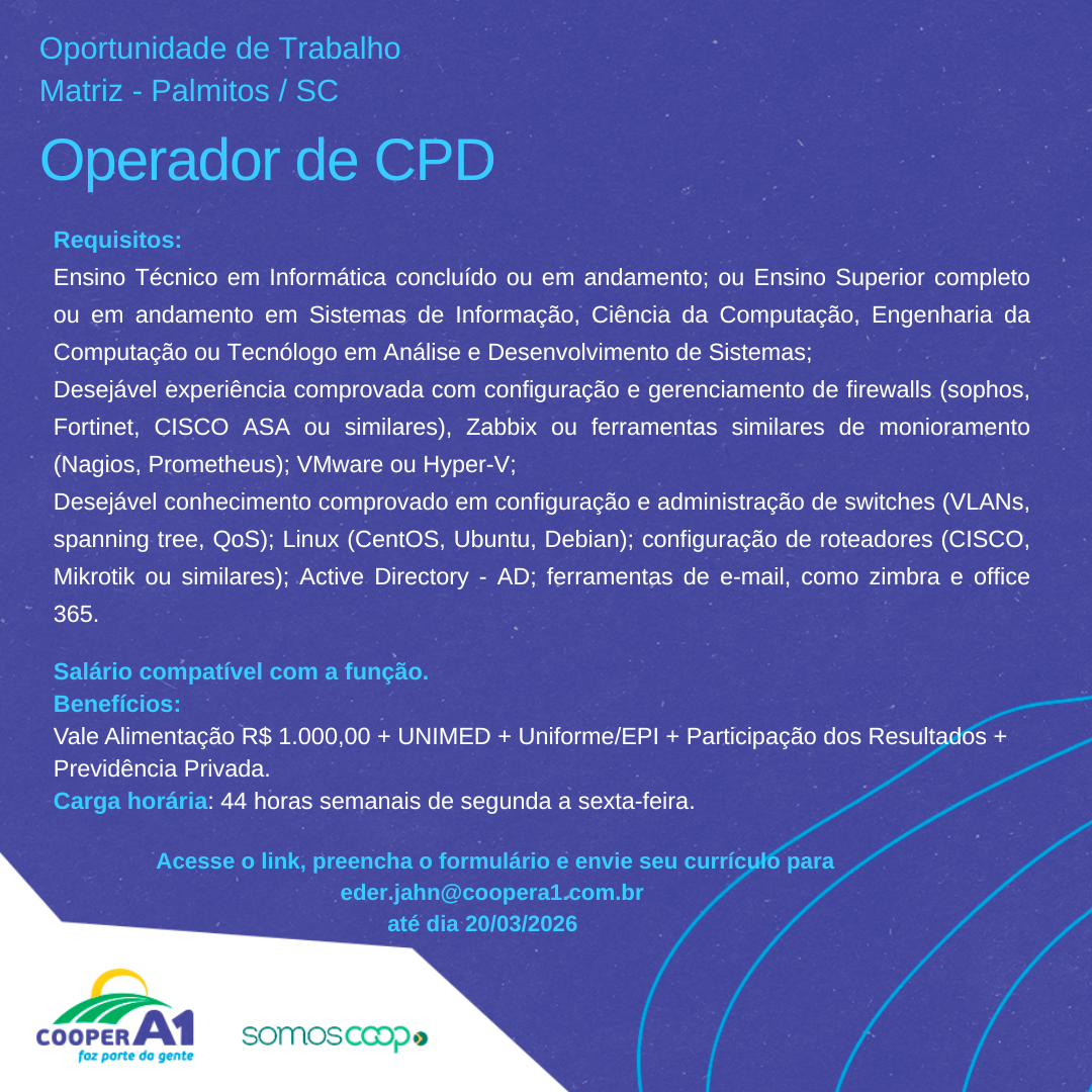 Descrição: Oportunidade para Operador de CPD.Para se inscrever, basta acessar o link, preencher o formulário de...